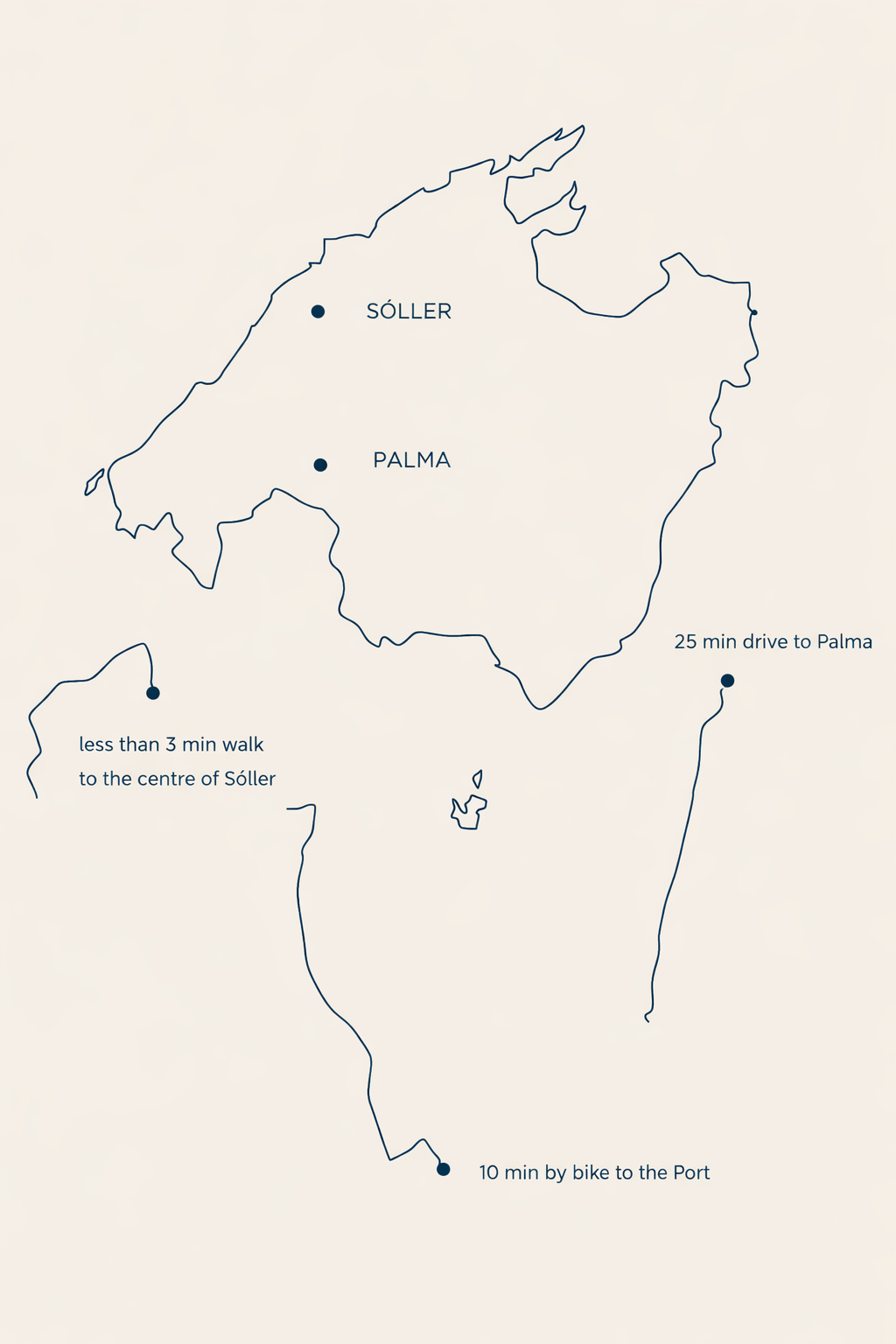 Puerto de Sóller and the beach at Playa d’en Repic are only about ten minutes away by bike, offering quick access to the sea, the harbour promenade and several excellent seaside restaurants.
